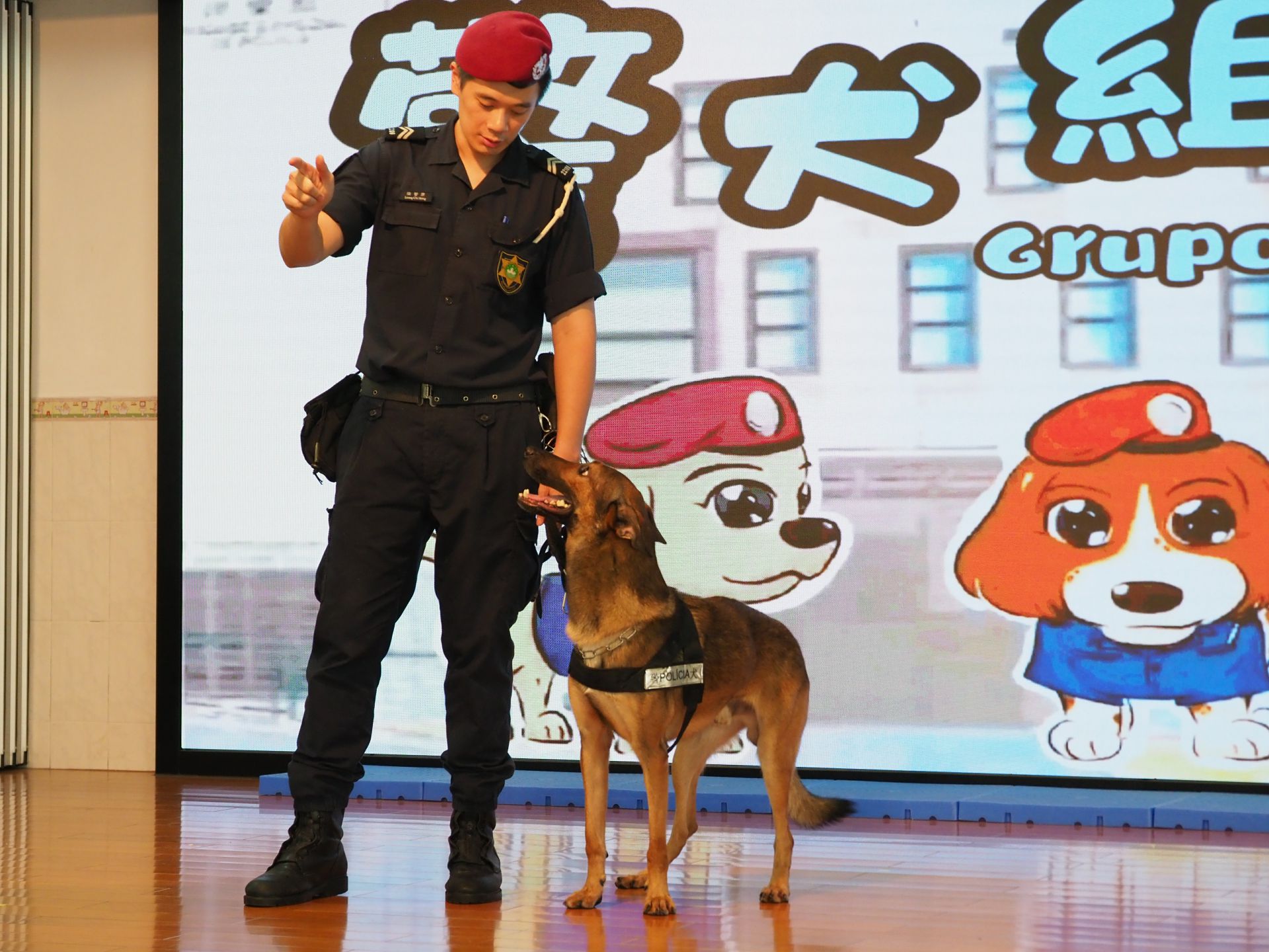 日前,澳門治安警察局警犬組到本校為幼稚園I3和小五級學生舉行了一場精彩的警犬表演,活動旨在提高學生們對警察工作以及警犬認識,更加強警民合作和普法教育。