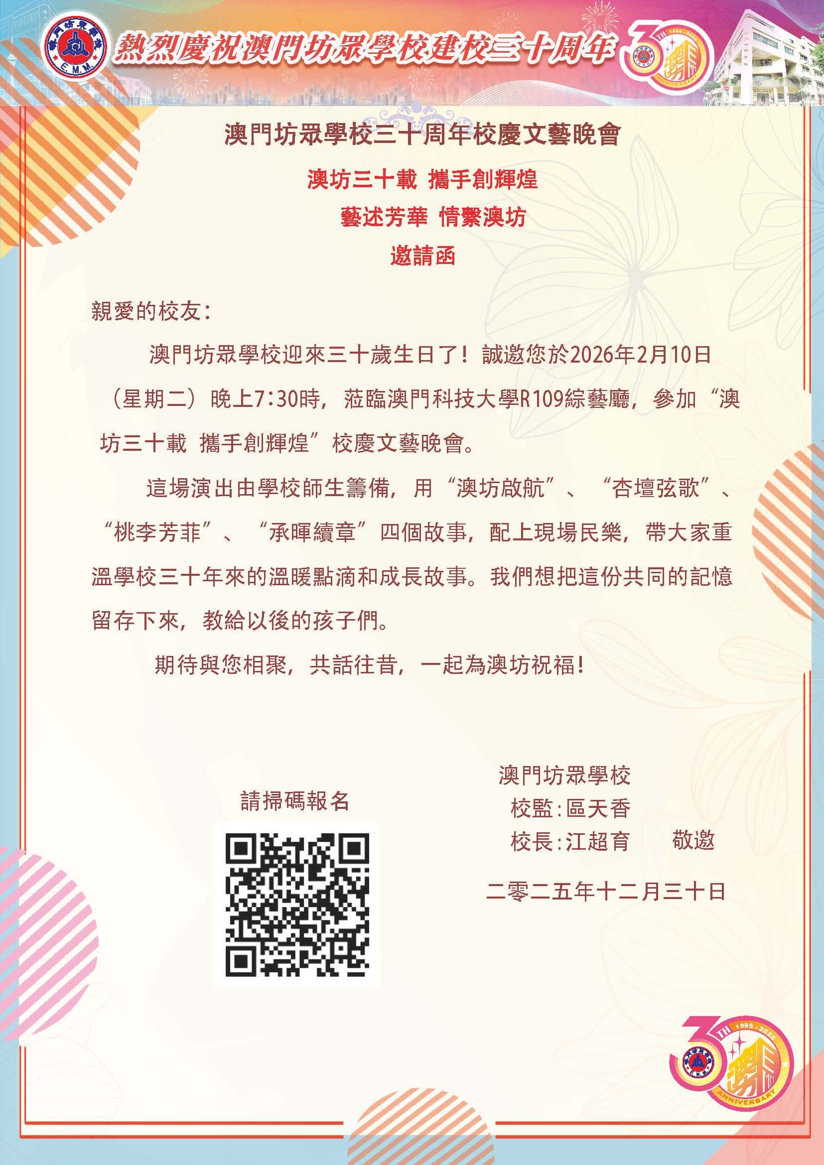 澳門坊眾學校三十周年校慶文藝晚會-校友邀請函